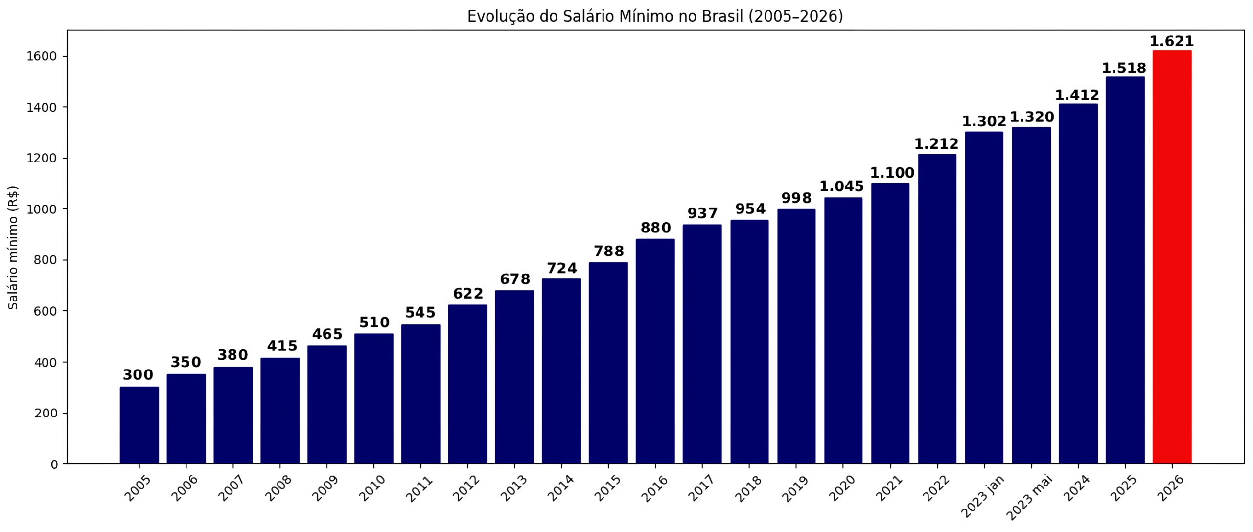 O salário mínimo nacional passa a ser de R$ 1.621 a partir desta quinta-feira (1º). O novo valor representa um reajuste de 6,79% em relação ao piso anterior, de R$ 1.518, e reflete a inflação acumulada medida pelo INPC em 12 meses até novembro, somada a um ganho real limitado pelas regras do arcabouço fiscal.